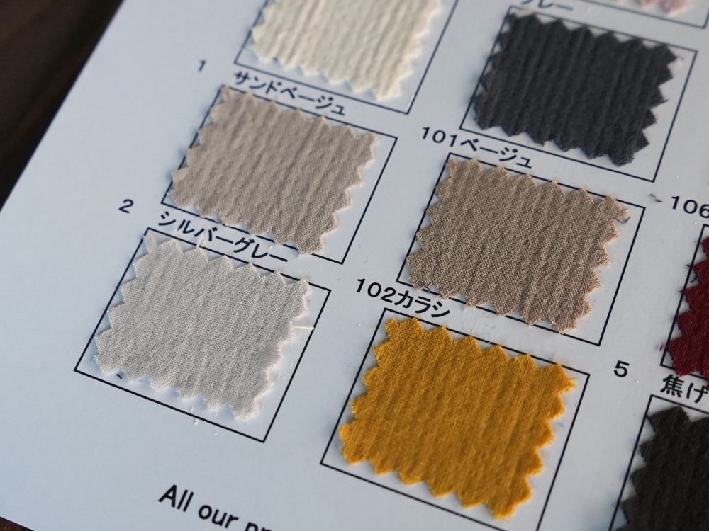 天然繊維特有の素材特性による微細欠点につきましては程度に関わらずノークレームにて予めご了承のほどお願いいたします。 商品の最新状況は営業までご確認ください。 やむを得ず廃色が発生する場合があります。 資料は手で作成しているため色番号、色名が不鮮明な場合があります。 ご了承ください。 資料の表面、裏面に記載してある特徴、注意点をご確認ください。 >>> 当ウェブサイトでは コットン(綿)、リネン(麻)、綿麻、ヘンプ、和紙、バンブー(竹)、レーヨン(ビスコース)、ナイロン、シルク などの素材を使用した生地をベースに 反応染料、硫化染料、顔料、墨(墨汁)、インディゴ、柿渋 などを使用した加工反を広く紹介しています 資料送付は無償です 是非、様々な生地をピックアップしてください |