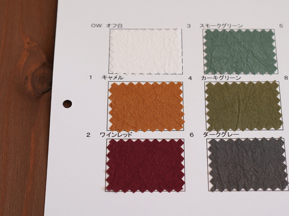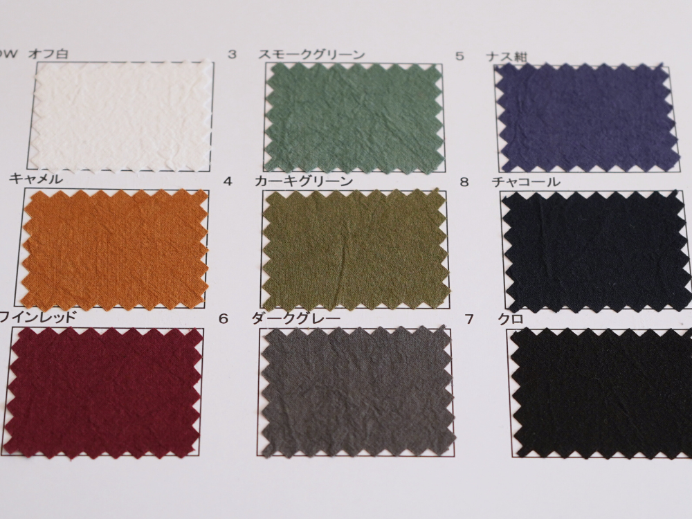 天然繊維特有の素材特性による微細欠点につきましては程度に関わらずノークレームにて予めご了承のほどお願いいたします。 商品の最新状況は営業までご確認ください。 やむを得ず廃色が発生する場合があります。 資料は手で作成しているため色番号、色名が不鮮明な場合があります。 ご了承ください。 資料の表面、裏面に記載してある特徴、注意点をご確認ください。 >>> 当ウェブサイトでは コットン(綿)、リネン(麻)、綿麻、ヘンプ、和紙、バンブー(竹)、レーヨン(ビスコース)、ナイロン、シルク などの素材を使用した生地をベースに 反応染料、硫化染料、顔料、墨(墨汁)、インディゴ、柿渋 などを使用した加工反を広く紹介しています 資料送付は無償です 是非、様々な生地をピックアップしてください |